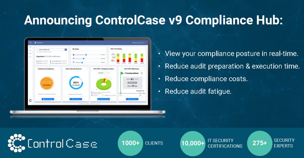 The updated version introduces key features including out-of-the-box NIST CSF Rating and compliance status to regulations you may be exploring. Fairfax, VA., March 2022 ControlCase, a leading provider of IT Security Certifications and Continuous Compliance Services announced the launch of V9